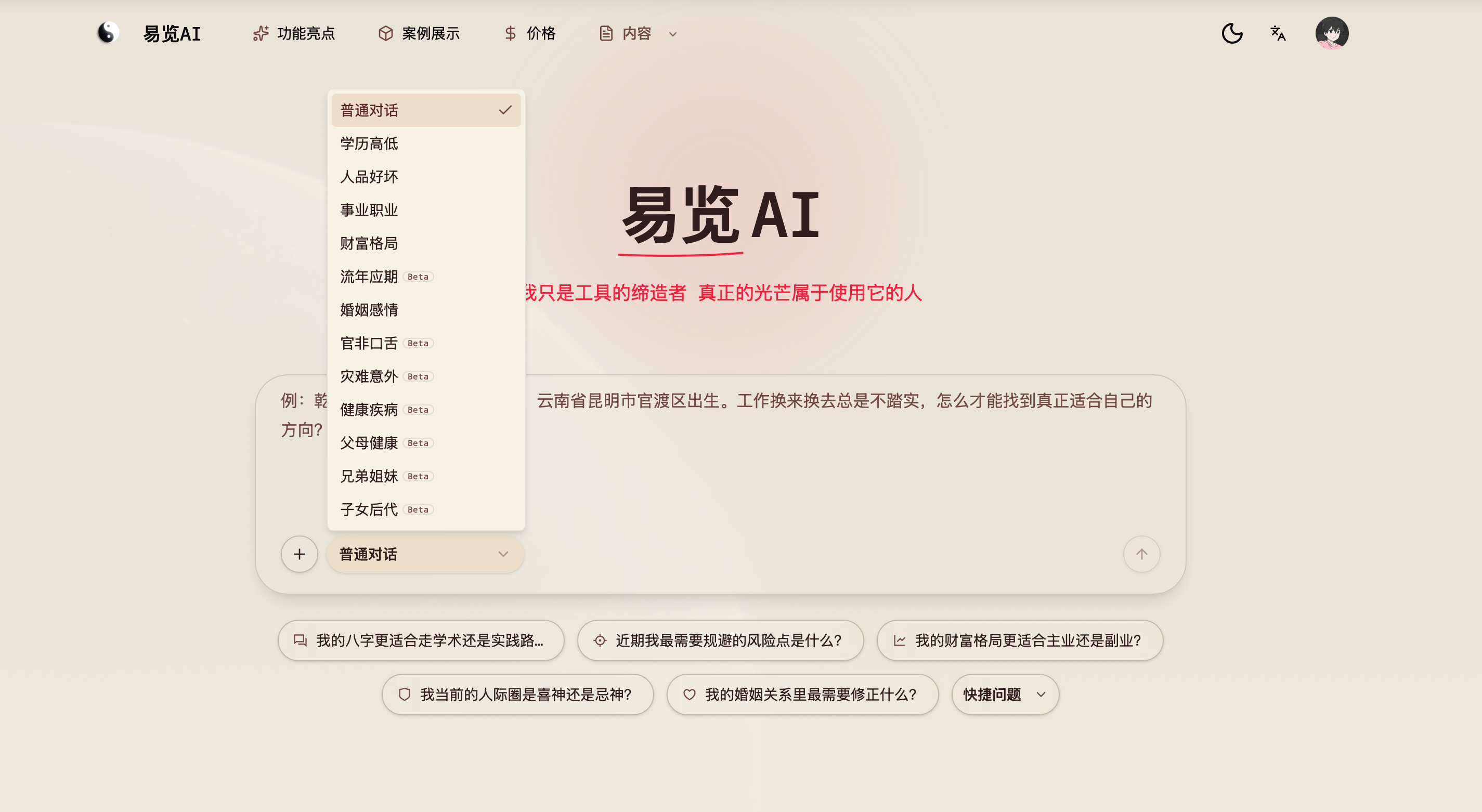 सामान्य चैट के अलावा, YiLan AI अब अधिक विशेष प्रोफेशनल मोड और दो-व्यक्ति विश्लेषण का समर्थन करता है। उपयोगकर्ता अपने प्रश्न के प्रकार के अनुसार शिक्षा, करियर, धन या विवाह जैसे अधिक लक्षित मोड चुन सकते हैं।